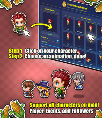 This RPG Maker MZ plugin lets you create event effects and preview them in real time extremely easily. Make trees sway in the wind, balls bounce, crops jump as they wait to be harvested, magic books float, and so much more. Unleash your creativity!