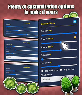 - Customize your sprite: Hue, Scale, Offset, Opacity, Blend mode, Flip, etc.