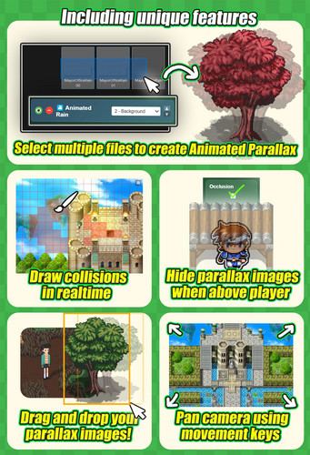 - Other Customizable Settings: Make parallax maps stick to the game map or move along with it. Adjust position, z-index, blend mode, looping, snapping mode, and much more