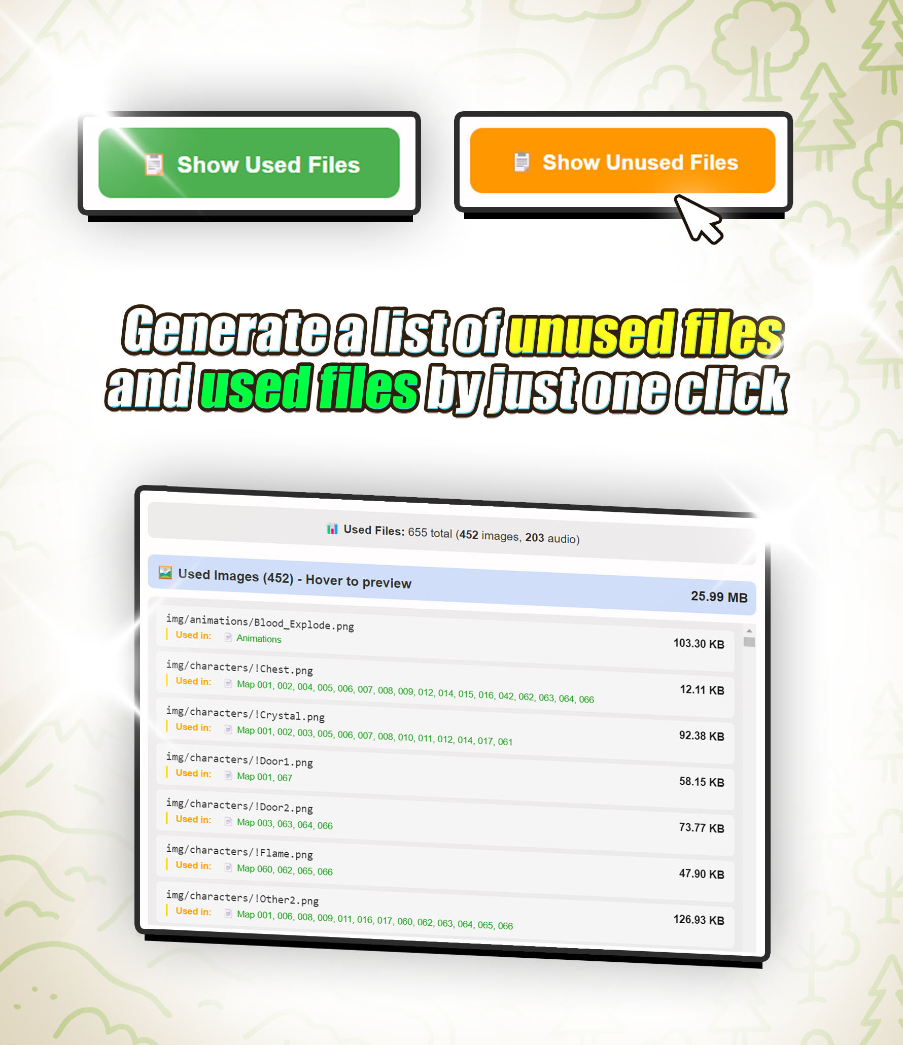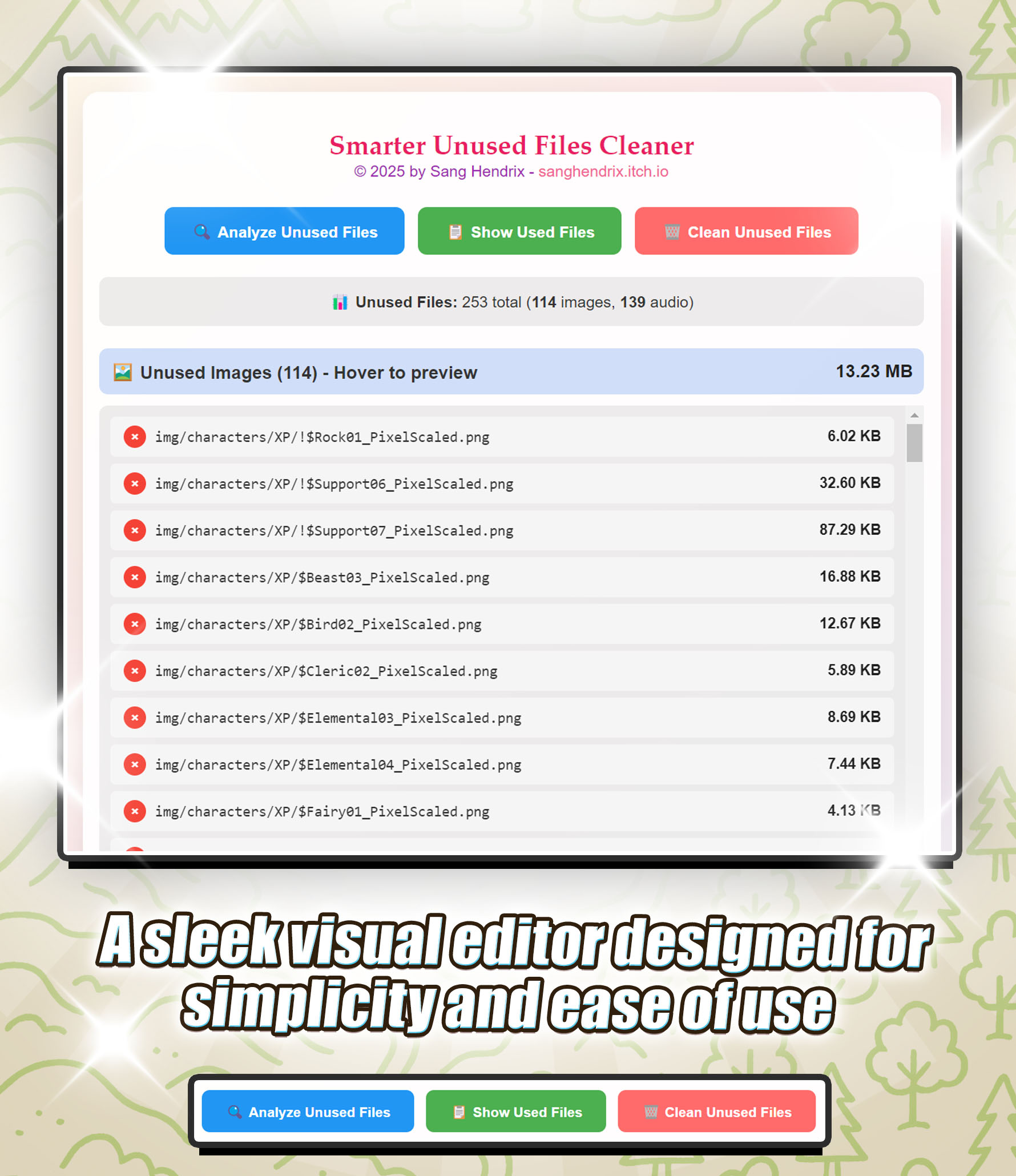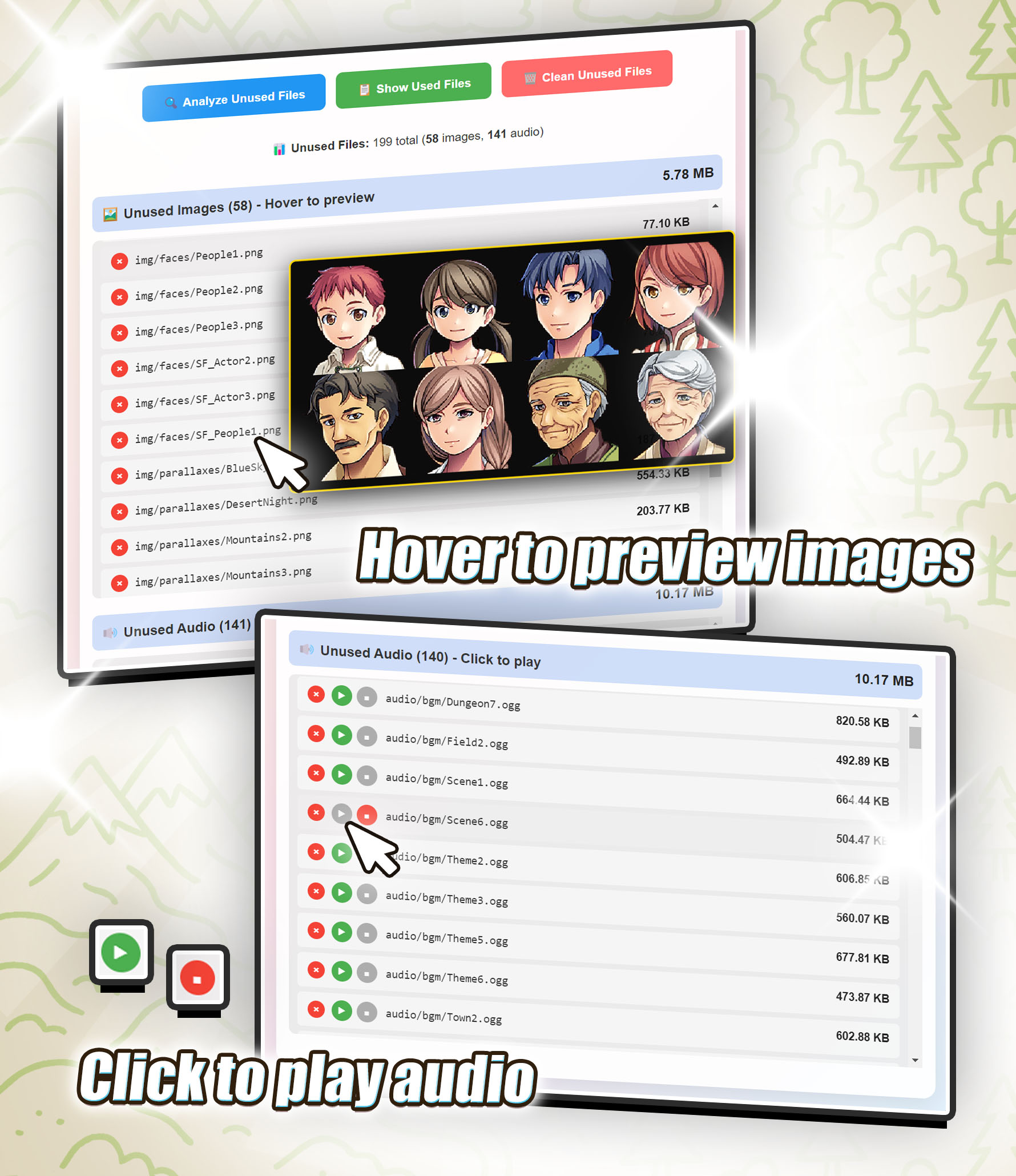 Plug in the plugin and press a button to launch the visual editor. The plugin will scan your game folder and check for files you never used. From there, preview and remove unused files selectively or all at once.